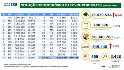 Já o número de pessoas que não resistiram à covid-19 no Brasil subiu para 549.448. Em 24 horas, foram registradas 1.108 mortes. Há ainda 3.428 óbitos em investigação no país. Há, ao todo, 780.326 pessoas com casos ativos da doença em acompanhamento por profissionais de saúde e 18.340.760 pacientes já se recuperaram.